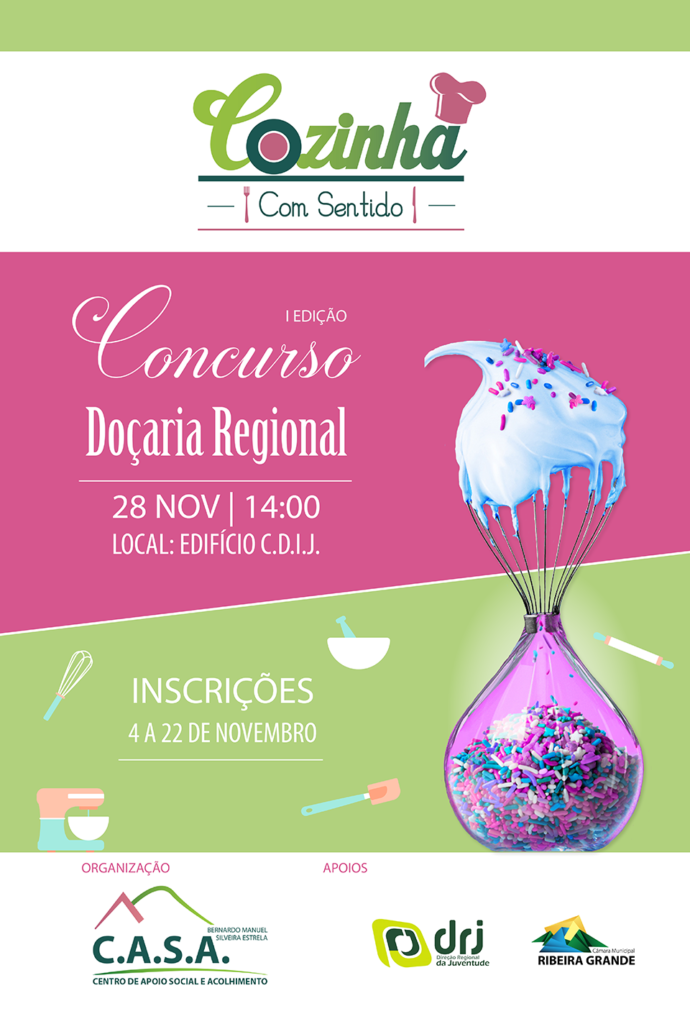 O CASA – Centro de Apoio Social e Acolhimento, Bernardo Manuel da Silveira Estrela, no âmbito do projeto “Cozinha Com Sentido” desenvolvido pela sua valência CDIJ «Escolh@ Cert@», leva a cabo a 1.ª edição de um concurso de Doçaria Regional, no próximo dia 28 de novembro, a partir das 14h00..